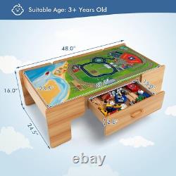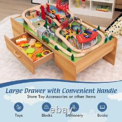 3 in 1 design with detachable tabletop suitable for playing building eating and studying. 84 pieces vivid track train toys allow for multiple building ways. Drawer under the tabletop offers storage space.