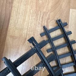 Twist the bell on top of the engine to turn on the engine and headlamp. Push the "horn" button on the remote to hear "All Aboard" and train sounds. To make the train move forward, push the black button on top of the engine. Pushing the black button again does not stop the train. To stop the train, twist the bell on top of the engine or push the "arrow up" button on the remote. To make the train go backwards, push the "arrow down" button on the remote. When the train is moving forward, pressing the "arrow down" button on the remote makes the train go backwards. Pushing the "arrow up" button when the train is moving backwards stops the train. Also, the top button on the remote doesn't seem to do anything. Items are in pre-owned condition with minor wear. One piece of curved track has minor damage and functions as intended. Please see photos for details and reach out with any questions.