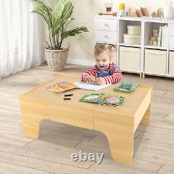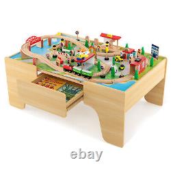 Color: Natural Material: MDF, Solid Wood Overall Dimension: 38" x 24.5" x 15.5" (L x W x H) Size of the Drawer: 14" x 14" x 2" (L x W x H) Applicable Age: 3+ Net Weight: 33 lbs Package includes: 1 x Train Table with Drawer 84 x Toy Pieces 1 x Instruction. Description: Our 84 pieces train table set is an ideal gift for kids aged 3+. The 2-in-1 reversible tabletop features an illustrated surface on one side and a smooth surface on the other. Thus, toddlers can freely build tracks, eat snacks, do crafts, study or draw.