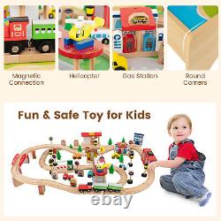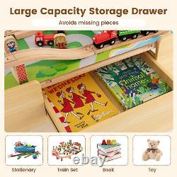 Features: 84 pieces train track accessories for multiple building ways Reversible &removable tabletop for kids to play, study or draw Including railways, figures, houses, signs, vehicles, bridges, tunnel, helicopter landing pad, gas station Large capacity drawer to store stationary, book, toy or train set Selected solid wood and MDF material for long-term use Round corners avoid bumping or scratching to protect kids' delicate skin ASTM and CPSIA certifications make it safe to use 15.5" reasonable height helps kids easily reach for various accessories Fun & safe toy for kids to inspire imagination and improve fine motor skills Smooth surface for easy cleaning Easy assembly with clear user's manual and included hardware Specifications: Color: Natural Material: MDF, Solid Wood Overall Dimension: 38" x 24.5" x 15.5" (L x W x H) Size of the Drawer: 14" x 14" x 2 (L x W x H) Applicable Age: 3+ Net Weight: 33 lbs Package includes: 1 x Train Table with Drawer 84 x Toy Pieces 1 x Instruction.