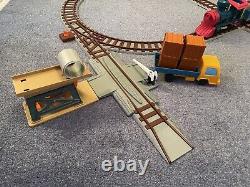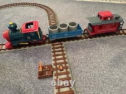 Train engine (light works) and 2 cars and a truck. The train engine works, but slows down with all cars and cargo. Uses 4 C batteries not included. One of the hooks that connects the cars is missing, but we used a small S hook or twist tie. Looking at other listings, I realized the yellow flat car is missing.