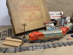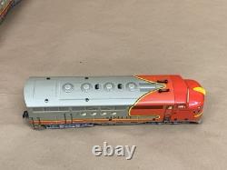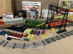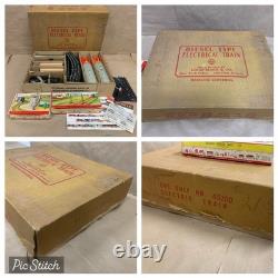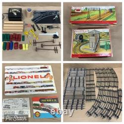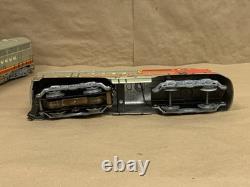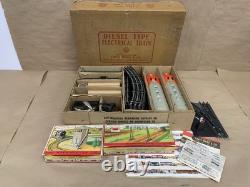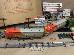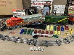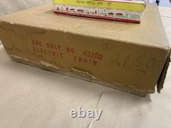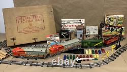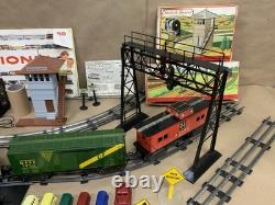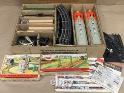 Cet ensemble est livré dans sa boîte d'origine avec un transformateur, 10 rails courbés, 15 rails droits, un pont de signalisation, une tour de commutation et des accessoires. Il est en très bon état vintage avec peu d'usure. Prêt à être ajouté à votre collection.