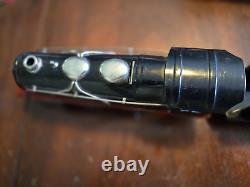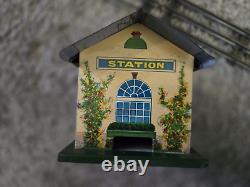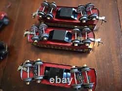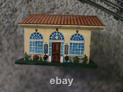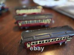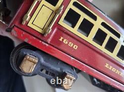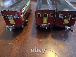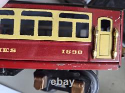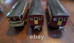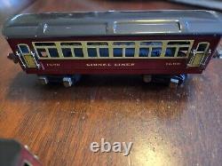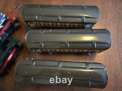 Ensemble de train électrique en tôle Lionel Junior vintage d'avant-guerre, 1056E avec voie supplémentaire. L'ensemble comprend deux voitures de coach en tôle 1690, une voiture d'observation en tôle 1691, une locomotive à vapeur 1681E avec tender, et une gare en tôle. Malheureusement, cet ensemble est sans sa source d'alimentation d'origine, donc il n'a pas été testé, mais les voitures de train et la gare semblent vraiment en bon état général avec des signes d'usure mineurs, et il est fourni avec de nombreuses pièces de voie supplémentaires. Sur les photos, je montre un circuit ovale monté avec 21 pièces de voie supplémentaires visibles au centre.