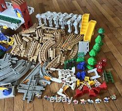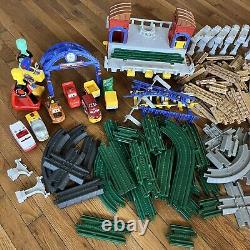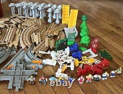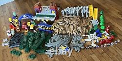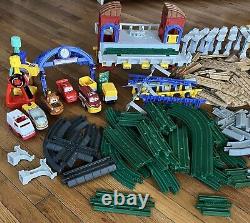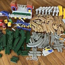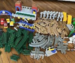 Ensemble de train Fisher Price GeoTrax. Ce lot de plus de 150 pièces comprend des voies, des voitures, des contrôleurs, des figurines, des arbres, des panneaux, etc.