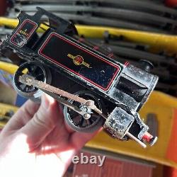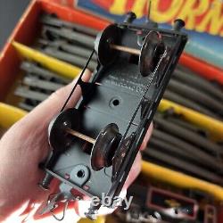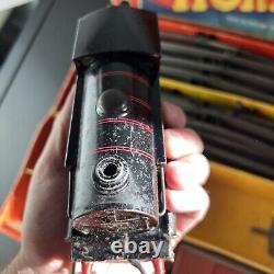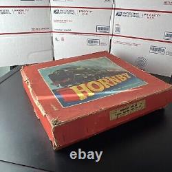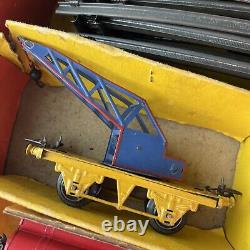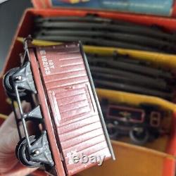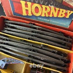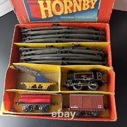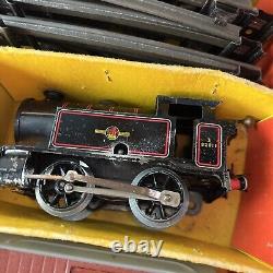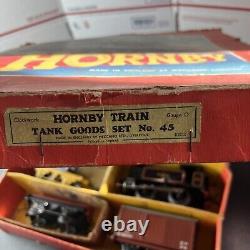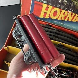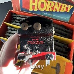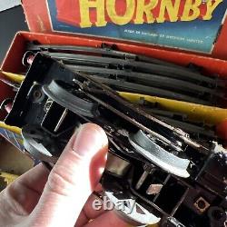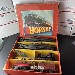Ensemble de train Hornby 45 avec boîte, locomotive, 3 wagons et rails, ainsi que la clé d'origine. Le train fonctionne comme il se doit.