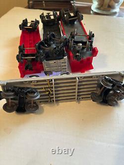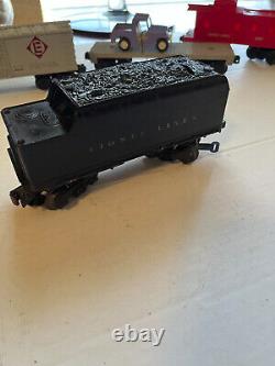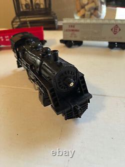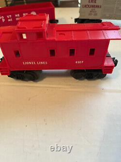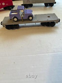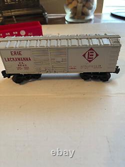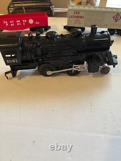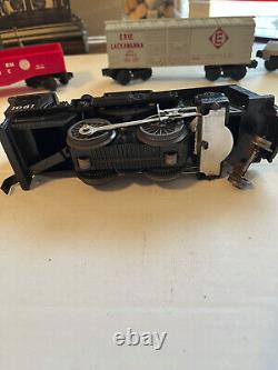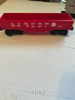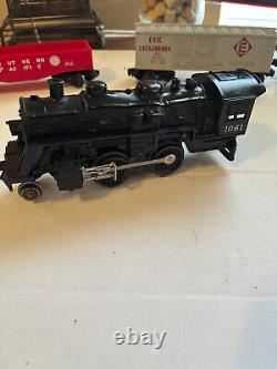 # Lionel1061 locomotive modifiée avec réglages avant-arrière, tiges de poussée améliorées, phare fonctionnel. # 9043 Lionel Erie Lackawanna wagon de marchandises. # 9032 Lionel Southern Pacific gondole. Wagon plat Lionel avec châssis en métal. Huit sections de rails courbés O/27 et quatre sections de rails droits et connecteur PLUS transformateur Marx de 50 watts qui fait très bien fonctionner cet ensemble.