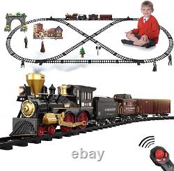 Ensemble de train locomotive à vapeur ? Cet ensemble de train de Noël comprend une télécommande 2,4 GHz, une locomotive à vapeur, un wagon de passagers, un wagon à charbon, un véhicule de marchandises, 21 pièces de voie de train et est équipé de sons de fumée, de lumière et de cartes de scène vives. La configuration améliorée offre à vos enfants des heures de jeu fantastiques. Jouet de train électrique avec télécommande ? Par rapport à d'autres trains ordinaires sur le marché, notre ensemble de train électrique utilise des télécommandes.